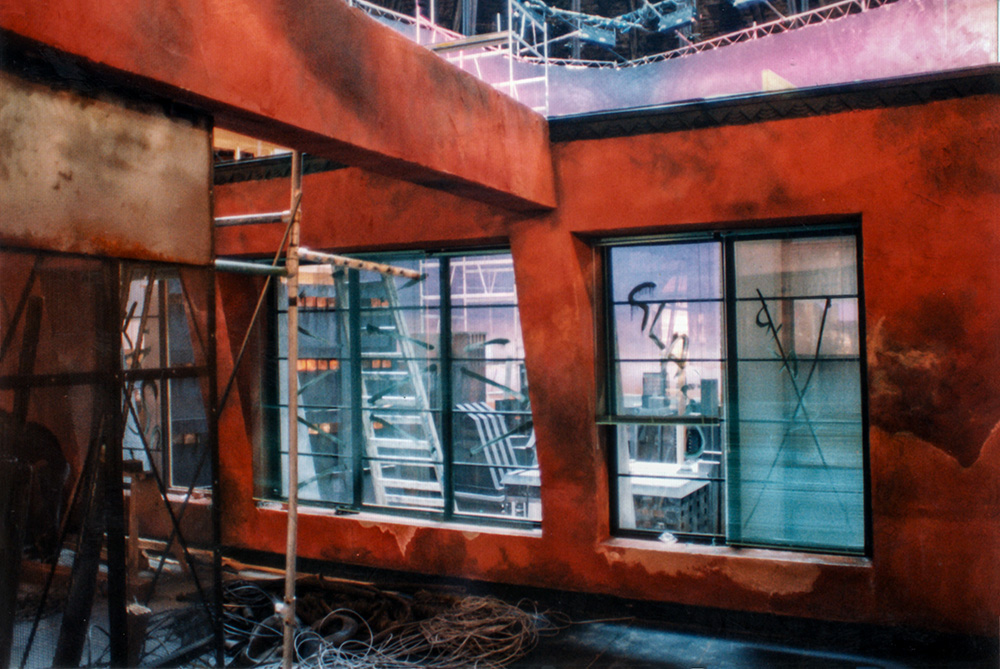 The glazing has been completed on the main apartment windows; we would go through a lot of sugar-glass once the action started. Photograph by Robert Courtney.