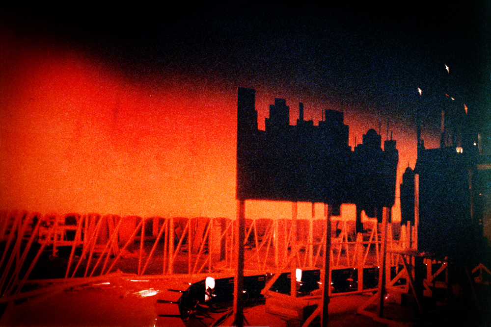 Then, finally, at the very back, at the base of the cyclorama, painted by the scenic artist, are the buildings in the distance. Photograph by Robert Courtney.