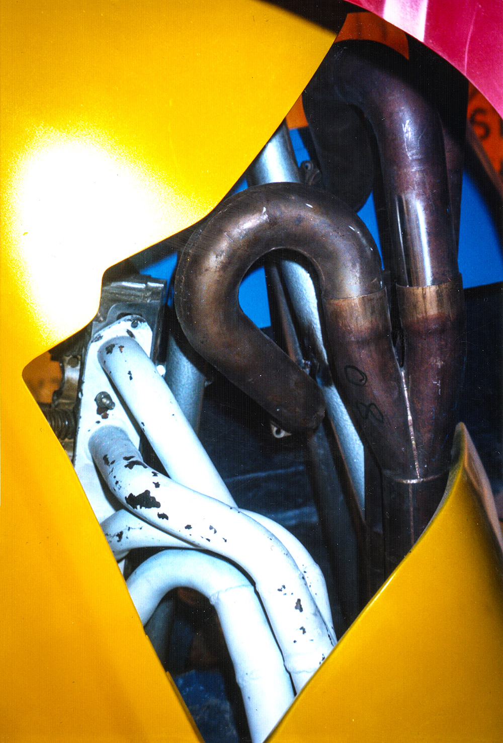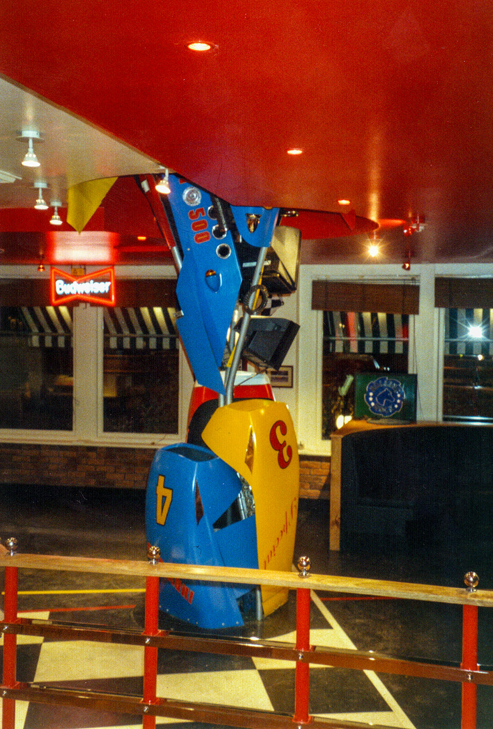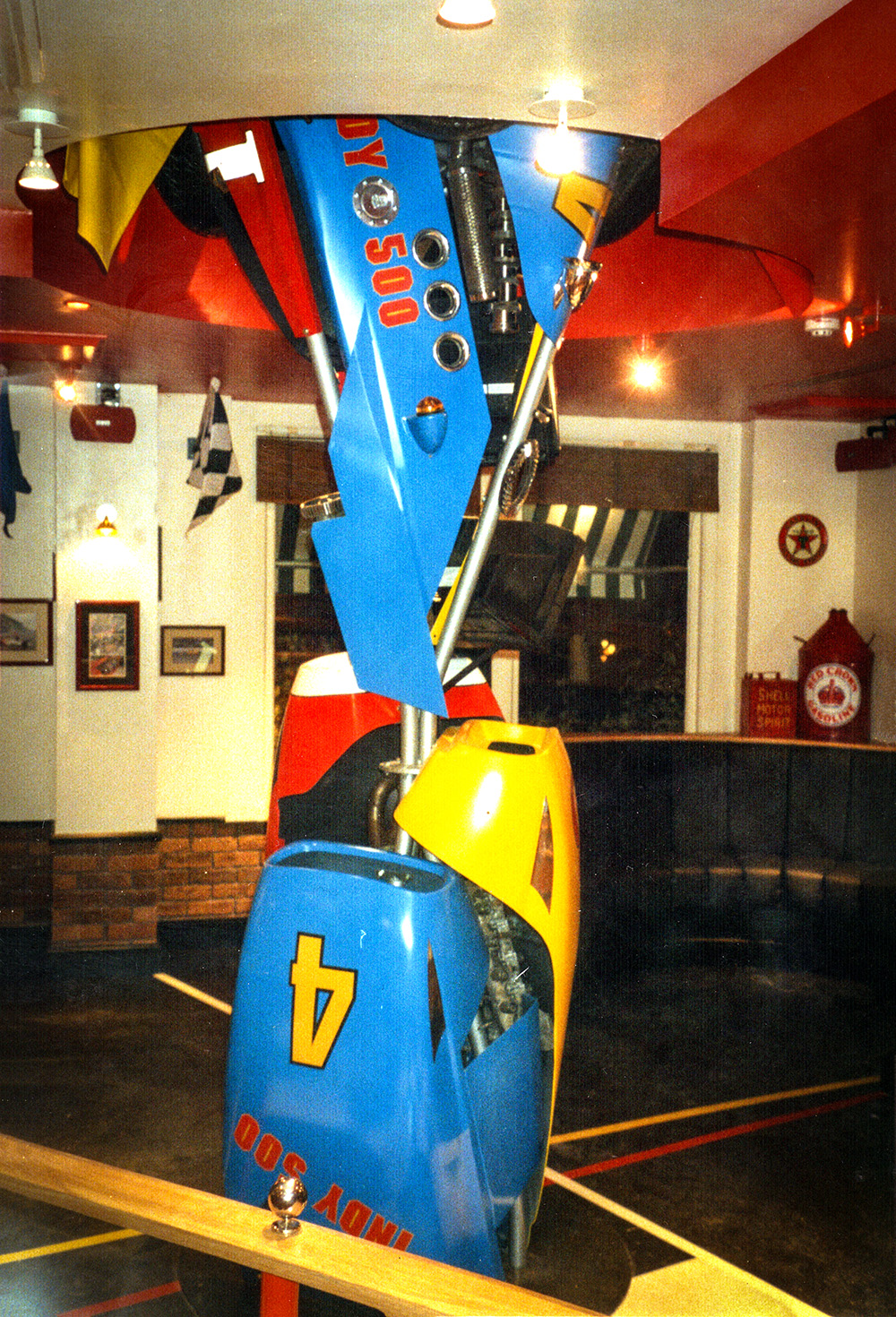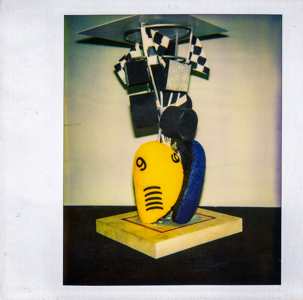 ‘Indy 500’ Sculpture made for a motor racing themed restaurant/bar in Epping. Photograph by Robert Courtney.I found a place that made body parts for Caterhams and F3 cars; the rest of the pieces came from breaker yards and second-hand F1 stores (though they were expensive). Photograph by Robert Courtney.Photograph by Robert Courtney.I like the vibrant colours of Motor Racing! Photograph by Robert Courtney.Photograph by Robert Courtney.Hammerite is the only paint for the job! Photograph by Robert Courtney.Photograph by Robert Courtney.Heavy metal at the base. Photograph by Robert Courtney.Original maquette for the sculpture by Robert Courtney, Polaroid by Robert Courtney.