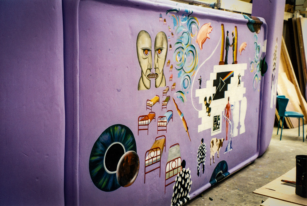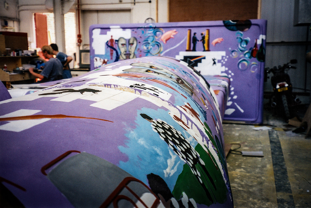 Yes, this Pink Floyd Armchair is real! Photograph by Robert Courtney.Wonderful weather and thankfully compliant cows. Photograph by Robert Courtney.The chair was so big we had to hire a large industrial unit to make it, then transport the parts to the studio for painting. Photograph by Robert Courtney.One of the arms and a side panel in the Model Solutions studio. Photograph by Robert Courtney.The side of the Pink Floyd armchair is like a giant canvas. Photo by Robert Courtney at Model Solutions.Onsite finishing-off, the whole chair was hand-painted by Model Solutions team of artists. Photograph by Robert Courtney.The chair was constructed the same way as the Division Bell heads, though somewhat larger and heavier. Model Solutions team ‘will it into place’. Photograph by Robert CourtneyDespite its size, we were concerned it would blow away. I didn’t fancy carrying it back across the countryside. Photograph by Robert Courtney.You might be able to create a picture with a prompt, but you will never have a shared magical experience. Photograph by Robert Courtney.Original Polaroid of the maquette for the Pink Floyd chair, made by Robert Courtney (it was about a foot high) and illustrated by one of Storm’s friends. I took hundreds of photos of armchairs (I still have them) in film prop houses, and Storm and I developed the ideal ‘comfy chair’. Slightly ‘off-centre’ Polaroid by Robert Courtney (I have others).
