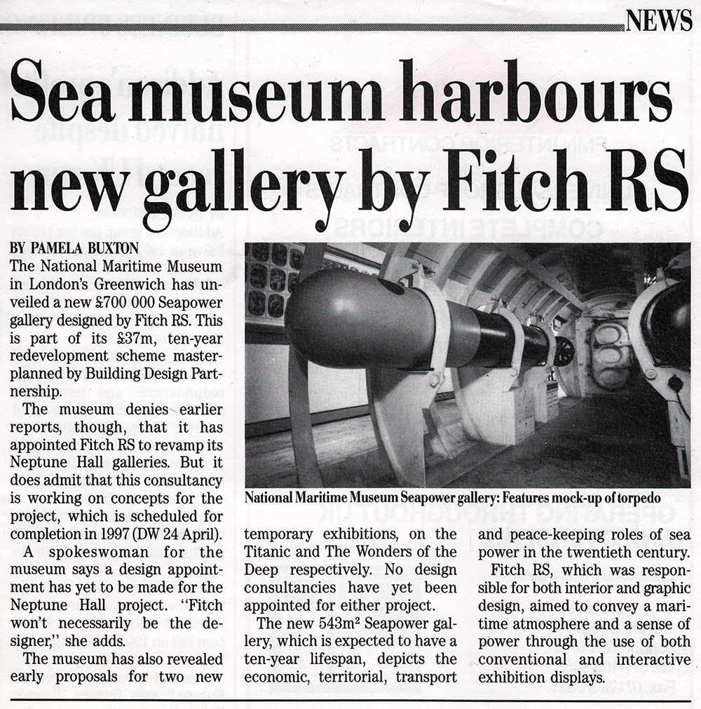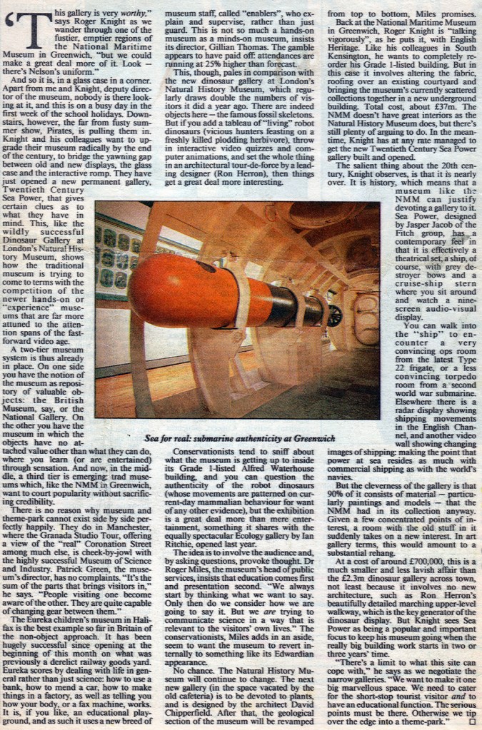 The 20th Century Seapower Exhibition at the Maritime Museum. Our Submarine Interior was inside this. Photograph by Robert Courtney.Full Size Submarine Interior section for the Maritime Museum at GreenwichView showing torpedo room sleeping arrangements. Photograph by Robert Courtney.20th Century Seapower exhibition at the Maritime Museum at GreenwichNews articleSunday Times 26 July 1992.