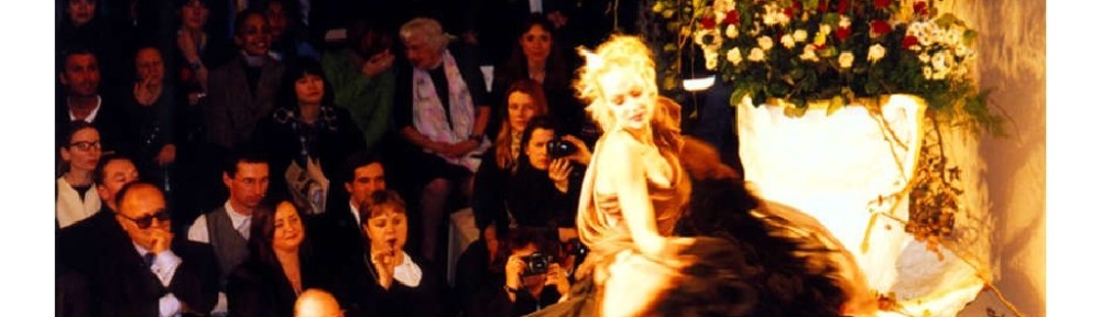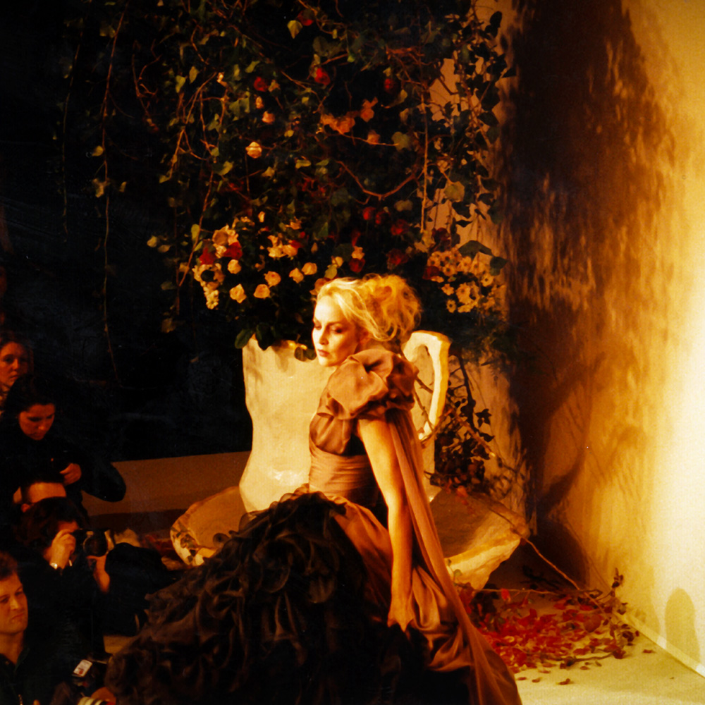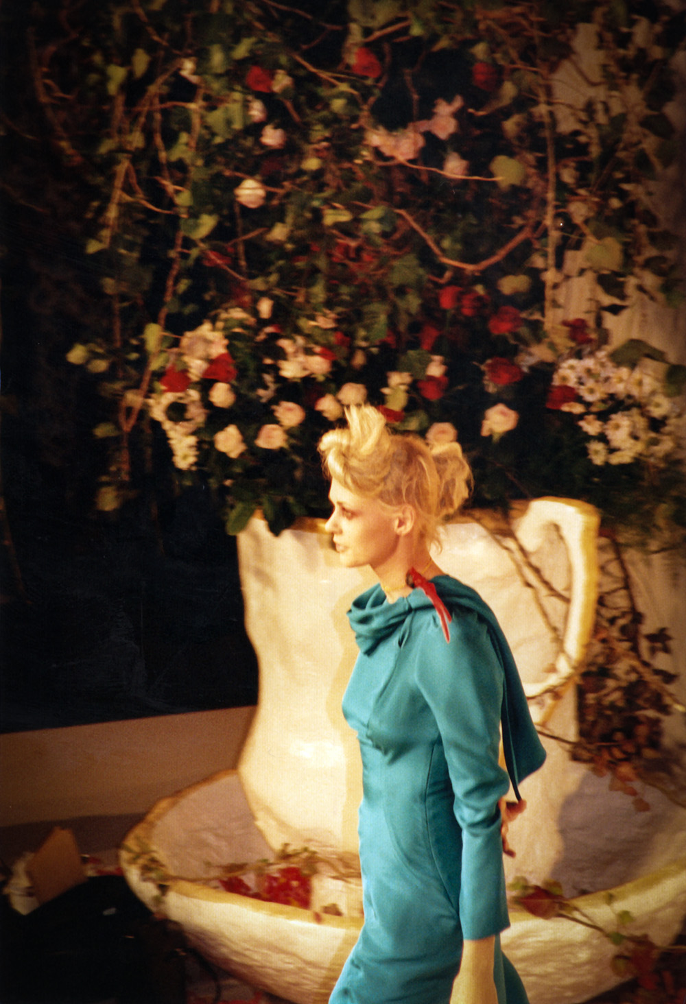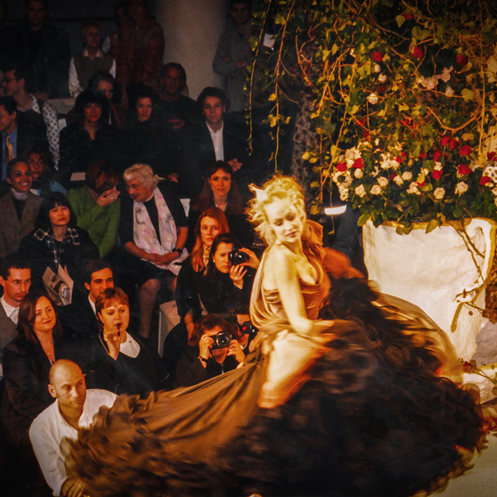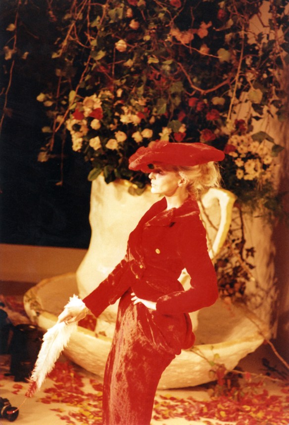 Jerry Hall modelling Vivienne Westwood Mad Hatter’s Tea Party, Paris. Photograph by Robert Courtney.
